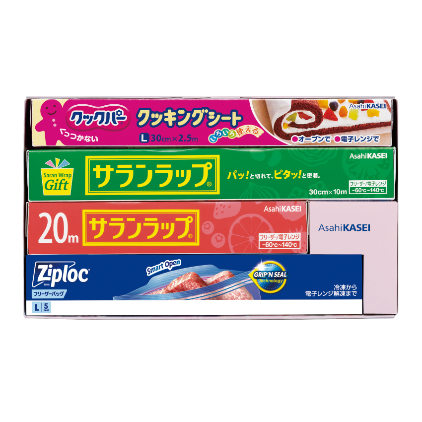 お料理保存に欠かせないサランラップとジップロックにクッキングシートもセットになったギフトボックスです。