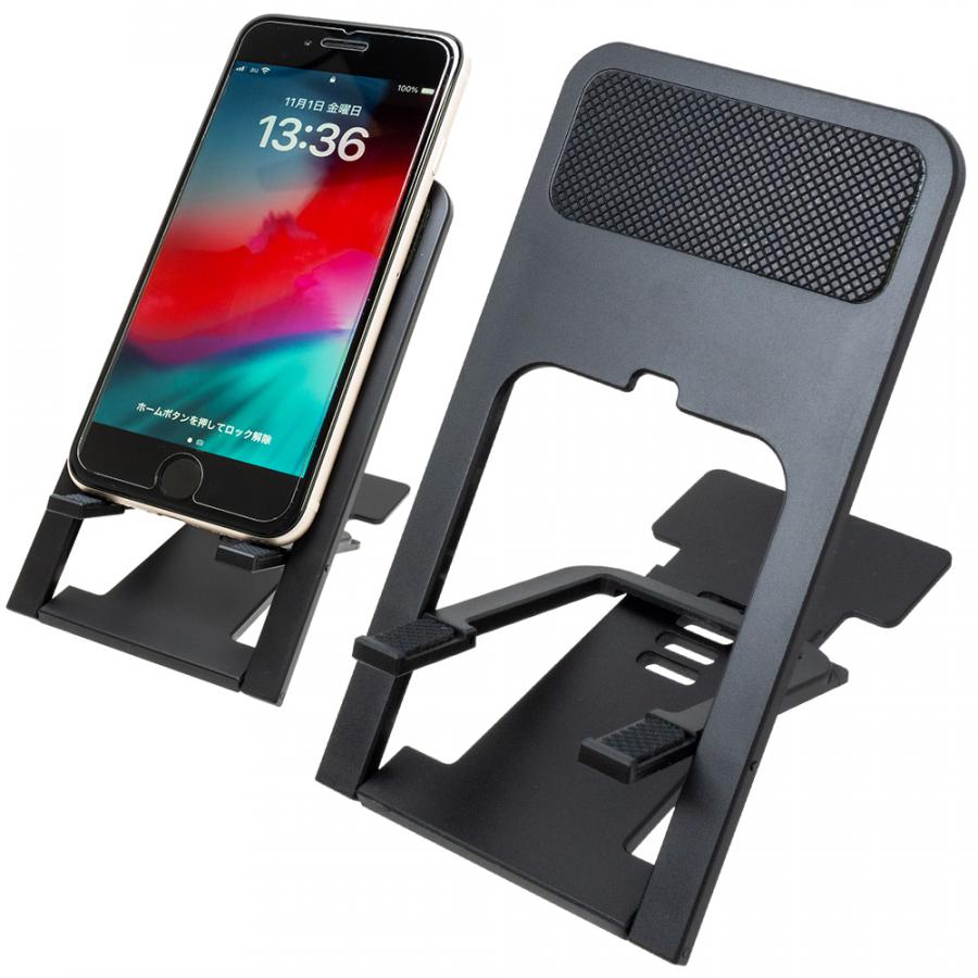 角度を4段階に調節できるモバイルスタンド。 USBコードを差したままでも端末を置くことができ、リモート会議等にも使いやすい仕様です。また、フラットにたたむことで携帯しやすくなります。