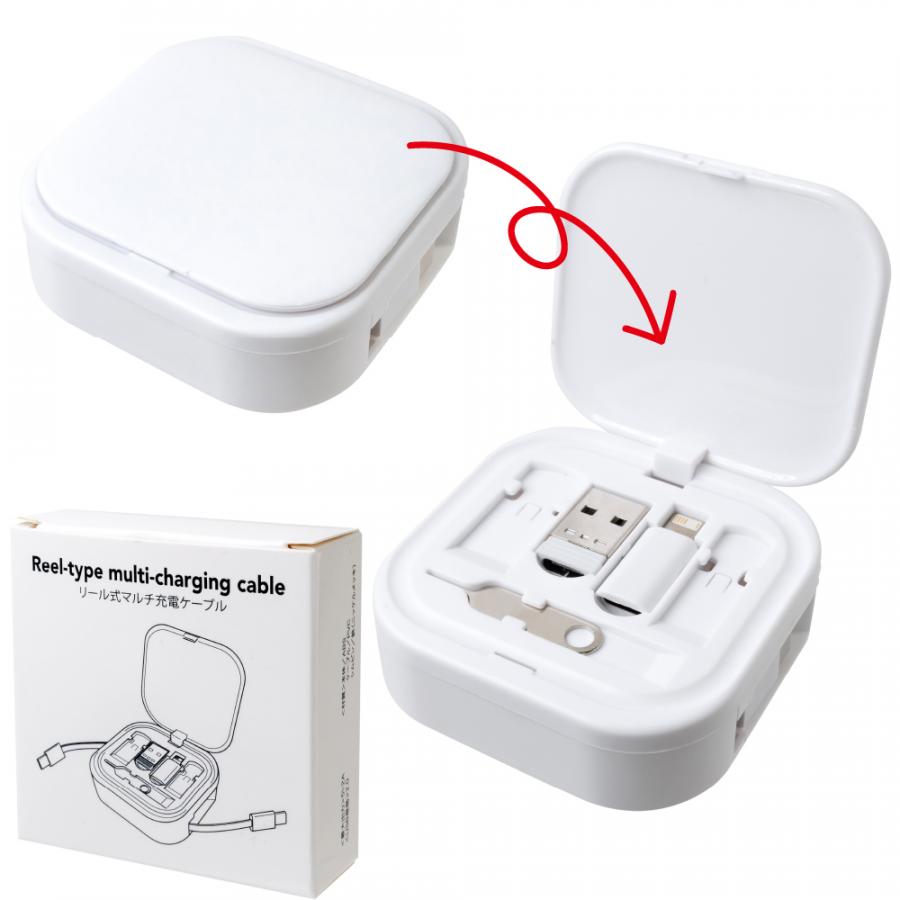 コンパクトなリール式スマホ充電ケーブル。 充電コードのプラグ形状はUSBタイプCになっており、カバーを開けるとUSBタイプAとアイフォン用アタッチメントが付いており複数の端末に対応できます。また、SIMピンも付属しており、空きスペースにはSIMカードの保管もできます。更に、底面のパーツを引き出すとスマホスタンドとしても利用できます。 ■最大出力:5V2A ■USB規格:2.0 ※ケーブルを引き出す際は左右同時に引いてください。 ※本製品は充電専用のためデータ転送はできません。