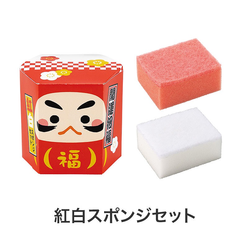 おめでたい紅白カラーのスポンジを、だるまデザインのパッケージに入れて2個セットにしました。