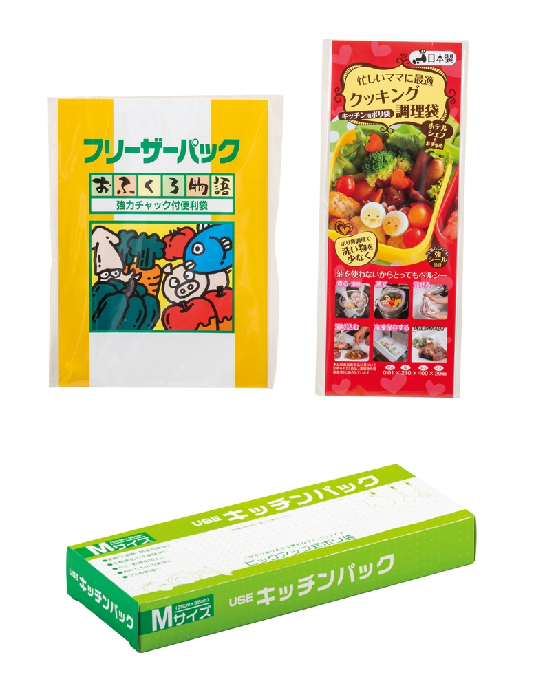 <セット内容> ●USEキッチンパック10枚BOX×1 ●クッキング調理袋2枚×1 ●フリーザーパック1枚×1