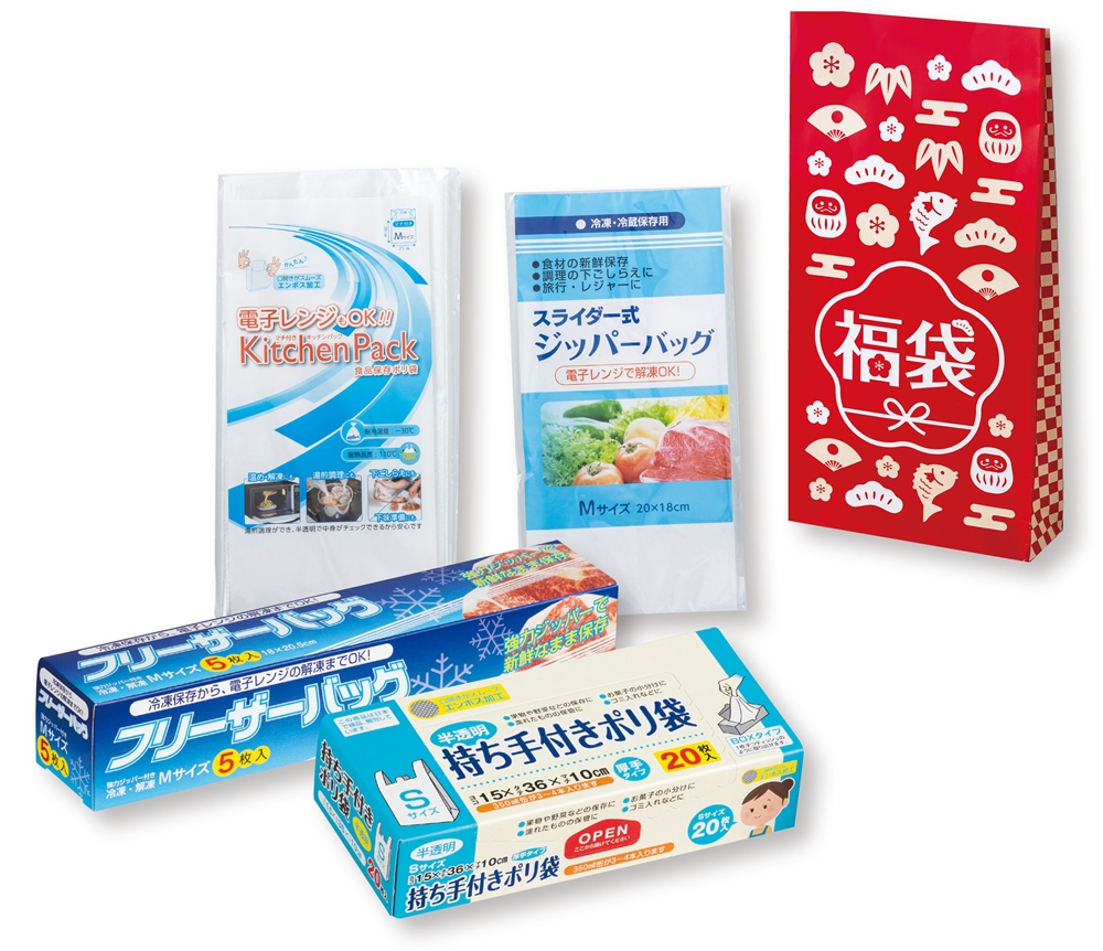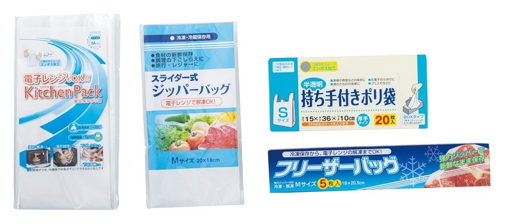<セット内容> ●持ち手付きポリ袋S20枚BOX×1 ●フリーザーバッグM5枚×1 ●レンジもOKキッチンパック10枚×1 ●スライダー式ジッパーバッグM1枚×1