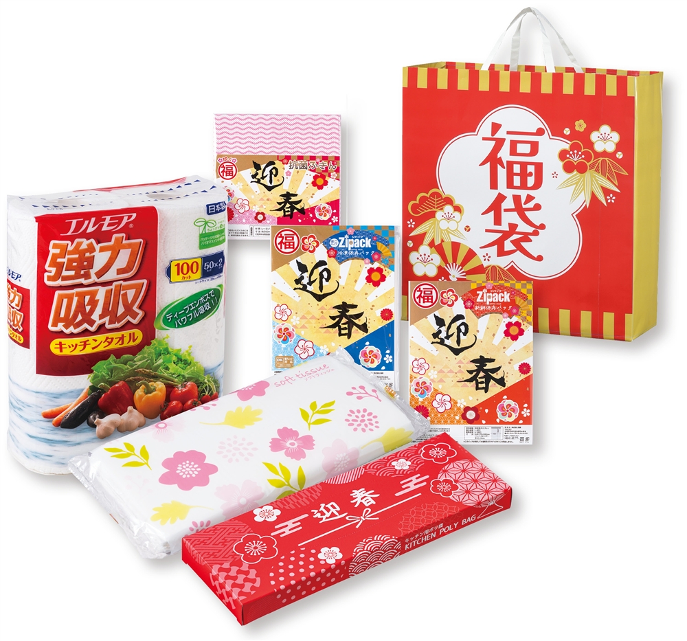 <セット内容> ●エルモアキッチンタオル2ロール×1 ●ソフトパック入りティッシュ40W×1 ●迎春キッチン用ポリ袋10枚BOX×1 ●迎春ジパック(冷凍)1枚入×1 ●迎春ジパック(冷蔵)1枚入×1 ●拭く拭く福ふきん(抗菌)×1