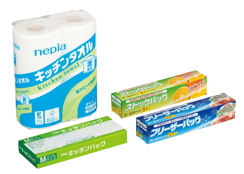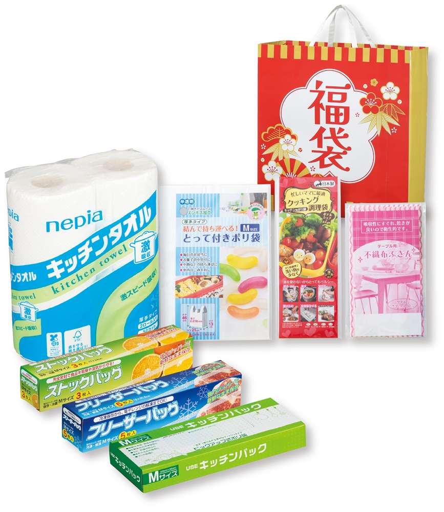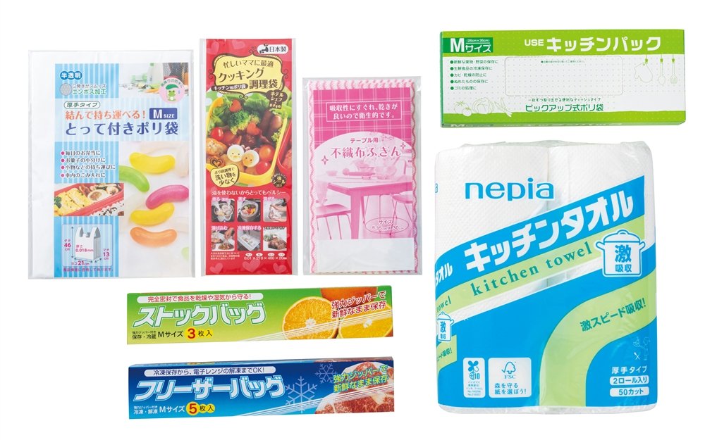 <セット内容> ●ネピアキッチンタオル2ロール×1 ●とって付きポリ袋M1枚入×1 ●クッキング調理袋1枚入×1 ●不織布ふきん×1 ●USEキッチンパックM10枚BOX×1 ●ストックバッグM3枚入×1 ●フリーザーバッグM5枚×1