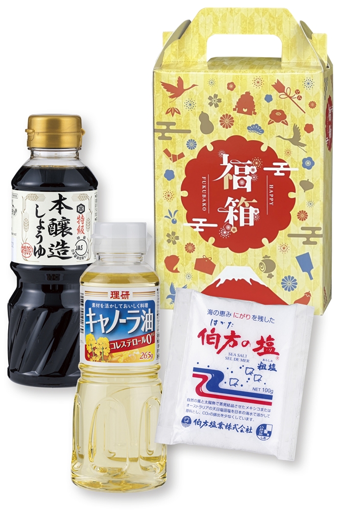 <セット内容> ・本醸造しょうゆ300ml×1 ・理研 キャノーラ油265g×1 ・伯方の塩100g(粗塩)×1