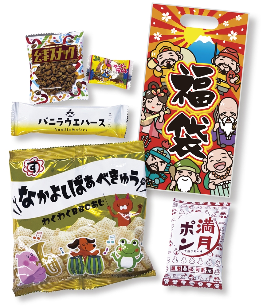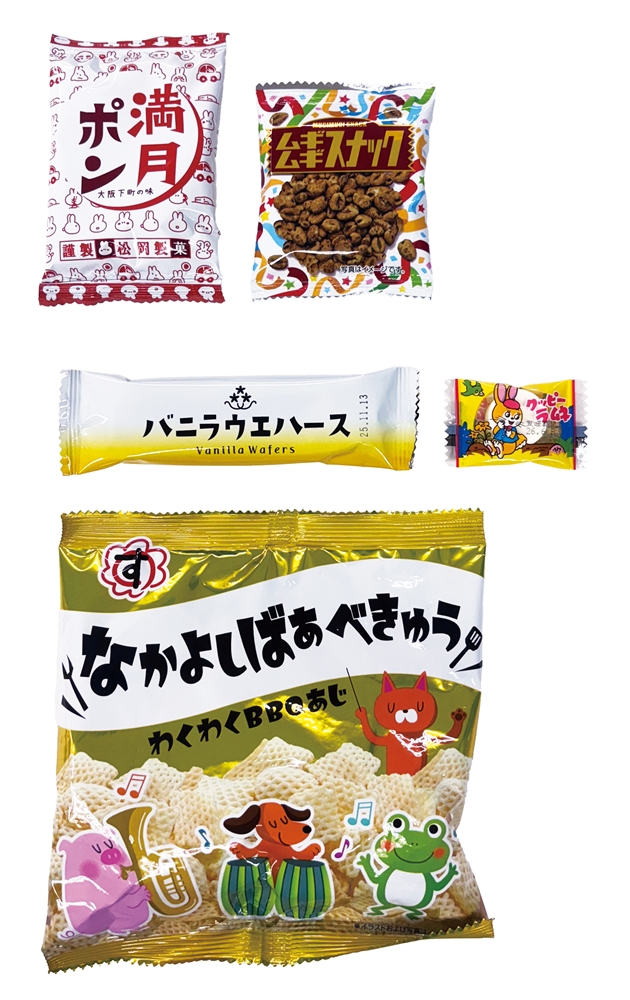 <セット内容> なかよしばあべきゅう×1 満月ポン×1 バニラウエハース×1 ムギムギスナック×1 クッピーラムネ(1粒)×1