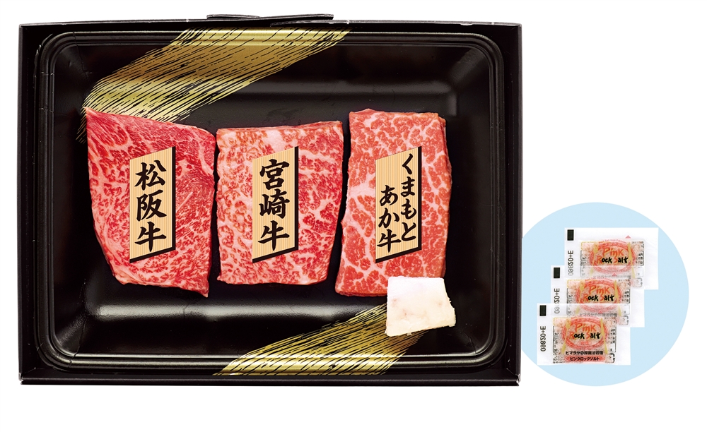 <セット内容> 松阪牛もも肉・宮崎牛もも肉・くまもとあか牛もも肉 各80g×各1(ヒマラヤ岩塩付)