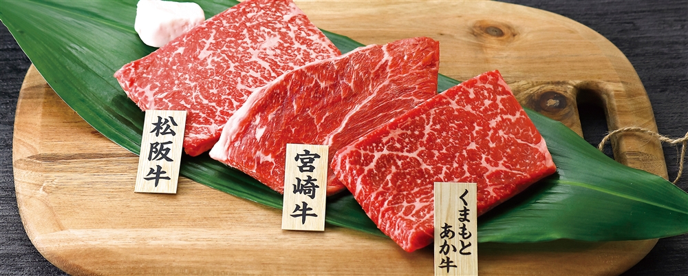 松阪牛(三重県)・宮崎牛(宮崎県)・くまもとあか牛(熊本県)のもも肉をステーキ用にカットしてお届けします。