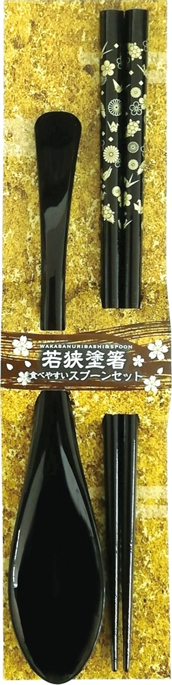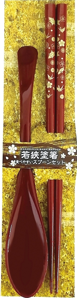 縁起の良い鶴と亀をモチーフにしたデザインの若狭塗箸と石川県産のスプーンのセットです。