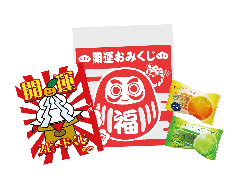 だるまのイラストPP袋の中にキャンディ2個とおみくじがセットされたイベント