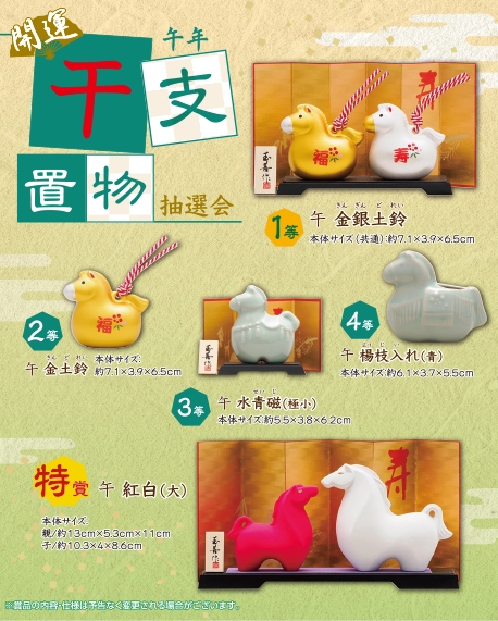 <キット内容> [特賞]午 紅白(大)・・・1本 [1等]午 金銀土鈴・・・3本 [2等]午 金土鈴・・・4本 [3等]午 水青磁(極小)・・・12本 [4等]午 楊枝入れ(青)・・・30本 <付属品> 抽選くじ×50、抽選箱×1、くじ明細書×1、告知用A3ポスター×1 ※賞品の内容・仕様は画像と異なる場合があります。あらかじめご了承ください。