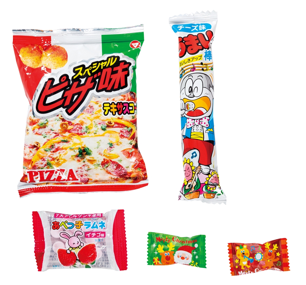 <セット内容> テキサスコーンピザ味10g うまい棒6g あべっ子ラムネ5g クリスマス柄キャンディ3g×2