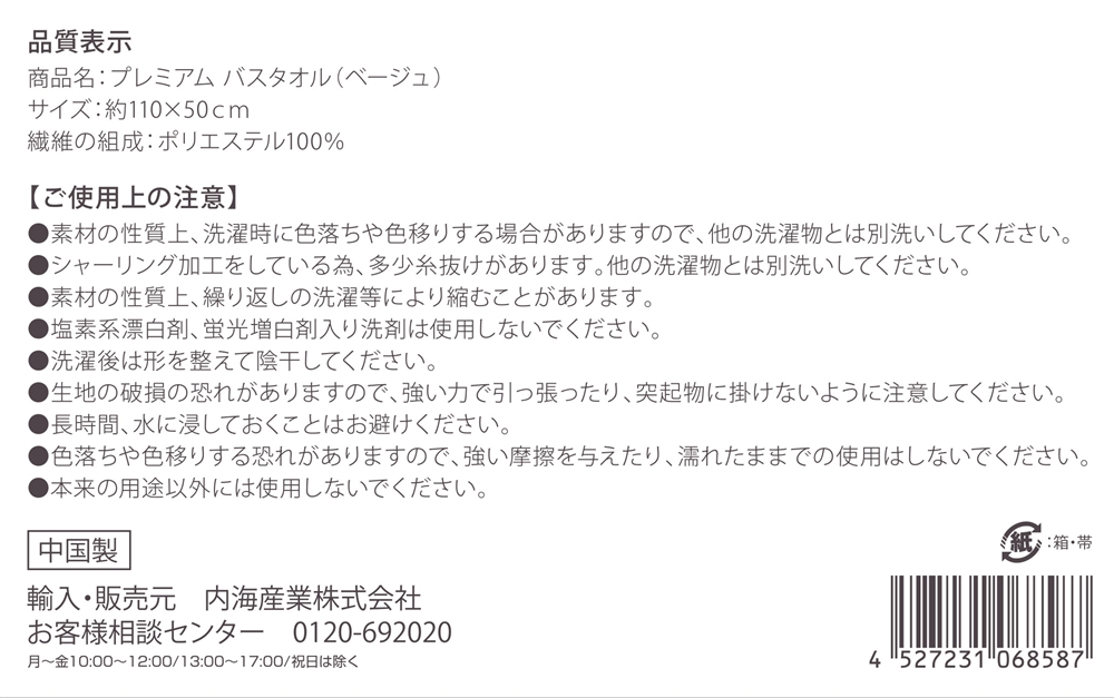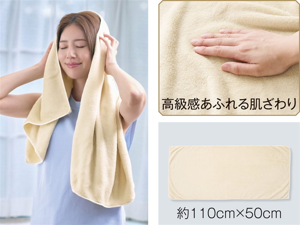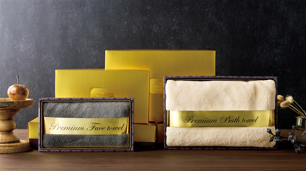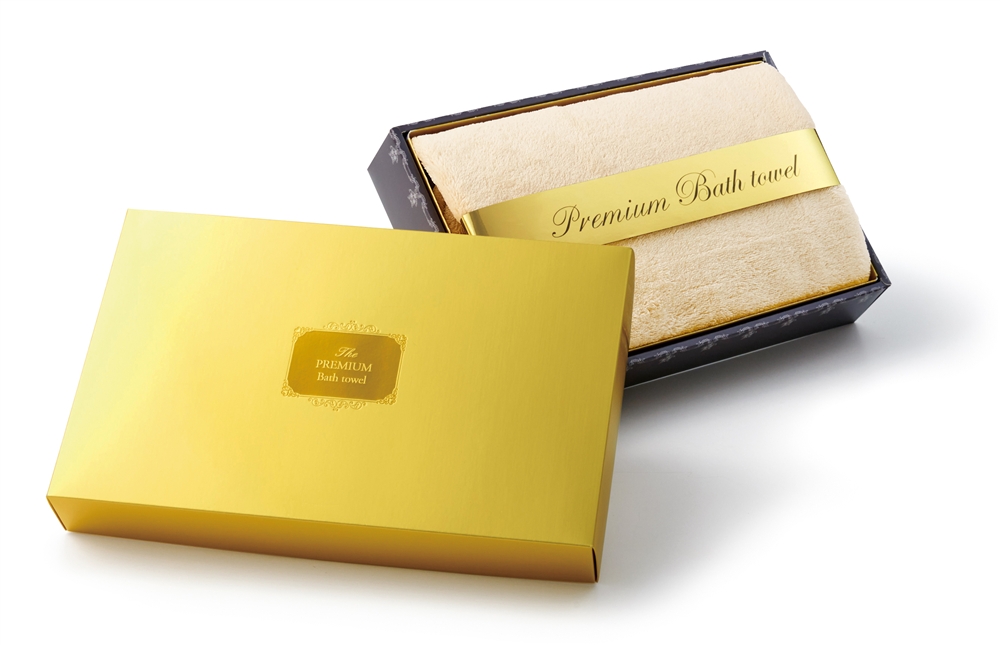 お風呂上りのお肌や濡れ髪をいたわる優しい使い心地。 ゴールドの帯を巻いて、箱を開けた時の驚きまでもプレミアム。贈答品に最適な身蓋式の化粧箱がその価値をさらに高めます。