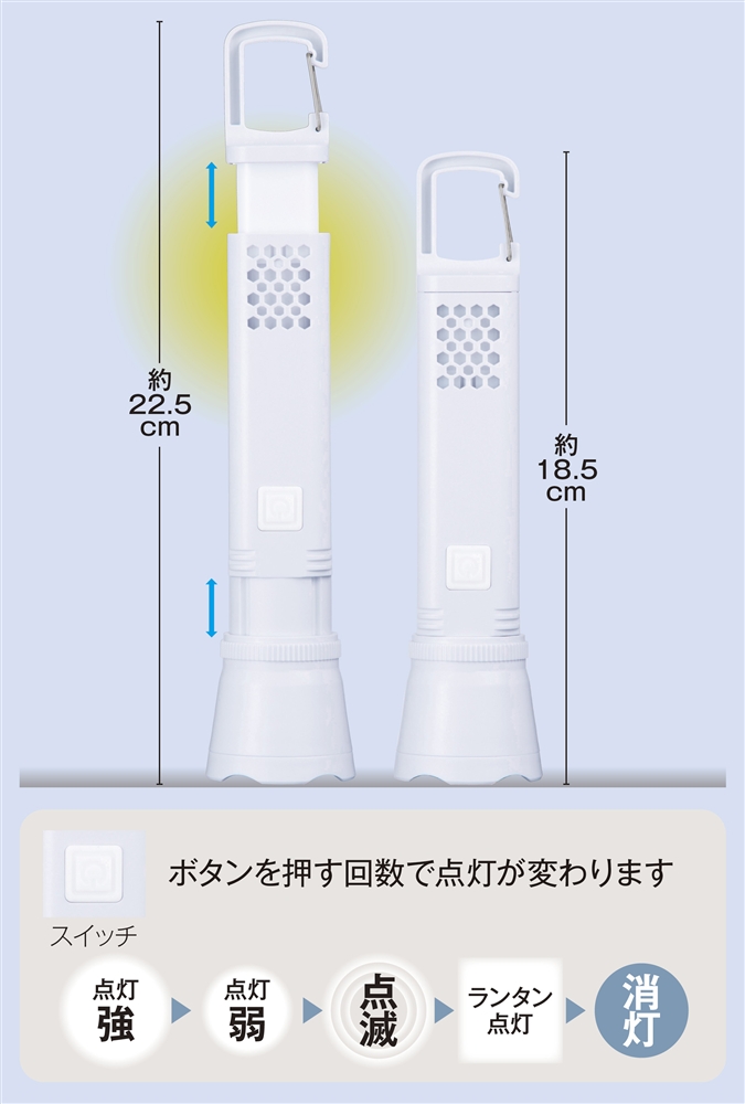 本体を伸ばせばランタンとして使用可能。ヘッド部分を伸縮させればスポットからワイドまで点灯できます。 スイッチを押すと<強→弱→点滅→ランタン→消灯>の順に切り替わります。