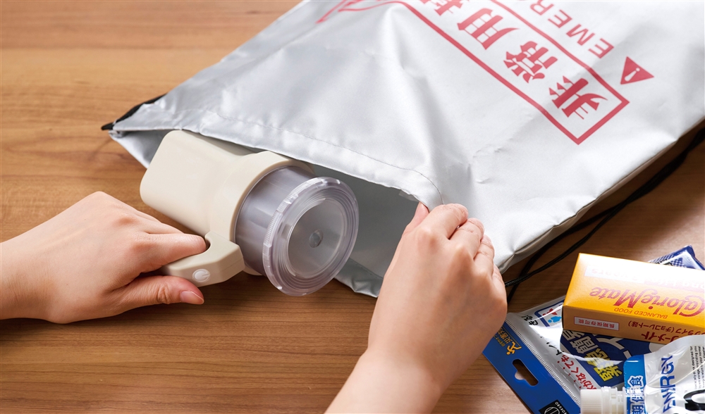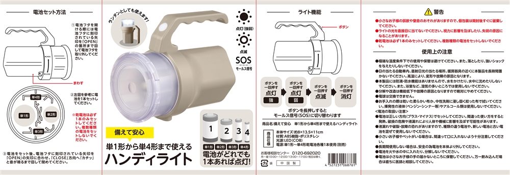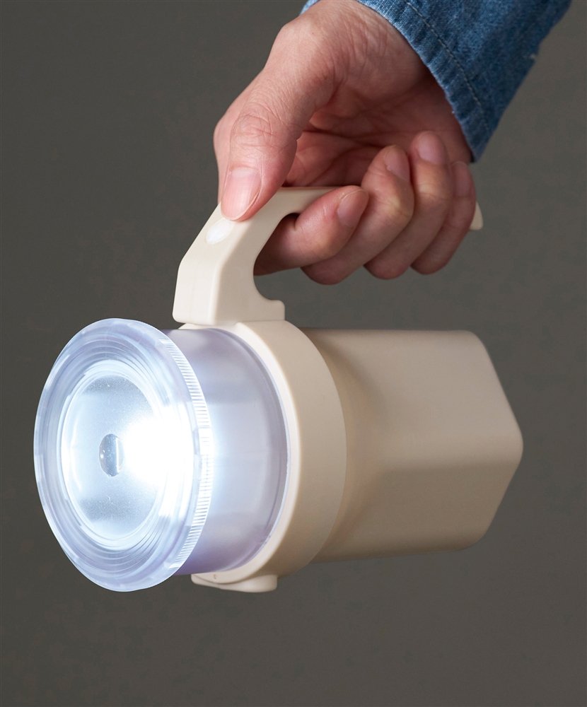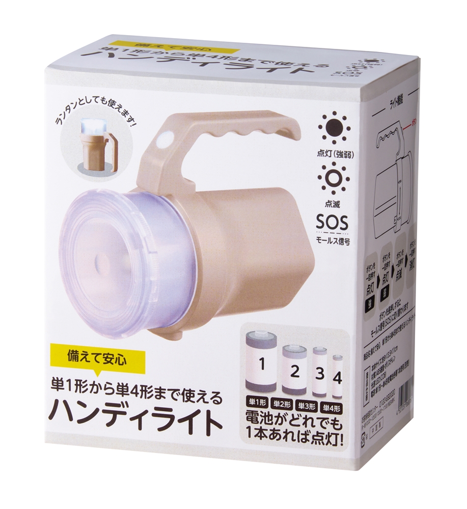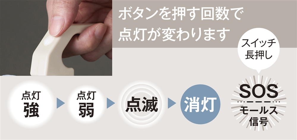 単一から単四までどの電池でも1本あれば使えます。ハンドル部分のスイッチを押す回数で、<強→弱→点滅→消灯→SOSモールス信号>に切り替わります。自宅・企業の防災の備えとして重宝します。