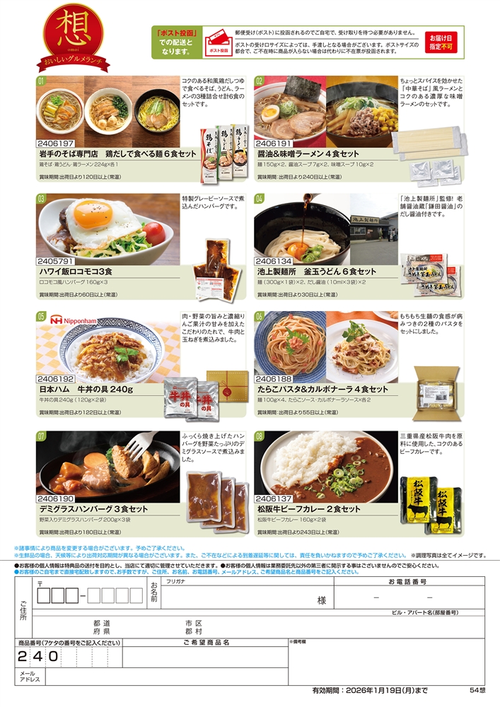 以下の8点よりお選びいただけます。 岩手のそば専門店 鶏だしで食べる麺6食セット 醤油&味噌ラーメン4食セット ハワイ飯ロコモコ3食 池上製麺所 釜玉うどん6食セット 日本ハム 牛丼の具240g たらこパスタ&カルボナーラ4食セット デミグラスハンバーグ3食セット 松坂牛ビーフカレー2食セット