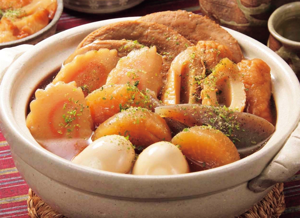 かつおをベースに調味しただしで名物黒はんぺんやなるとなどの練り物を入れ、じっくりと煮込みました。