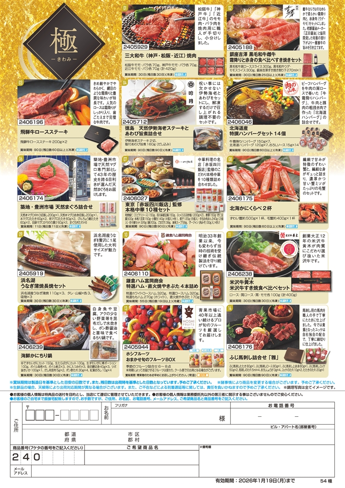 以下の14点よりお選びいただけます。 三大和牛(神戸・松坂・近江)焼肉 銀座吉澤 黒毛和牛雌牛 霜降りと赤身の食べ比べすき焼きセット 飛騨牛ロースステーキ400g 徳島 天然伊勢海老ステーキとあわび旨煮詰合せ 北海道産 特選ハンバーグセット14個 築地・豊洲市場 天然まぐろ詰合せ 東京「赤坂四川飯店」監修 本格中華10種セット 北海かにくらべ2杯 浜名湖うなぎ蒲焼長焼セット 鎌倉ハム 特選ハム・直火焼やきぶた4本詰め 米沢牛黄木 米沢牛すき焼食べ比べセット 海鮮かにちり鍋 ホシフルーツ おまかせ旬のフルーツBOX ふじ馬刺し詰合せ「雅」