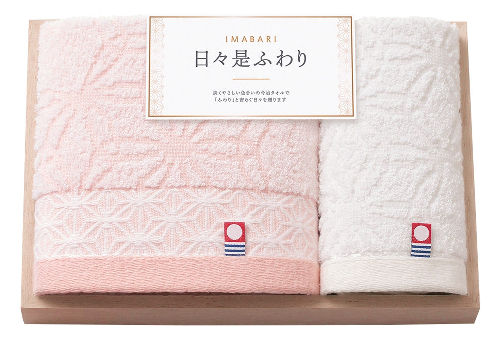 淡くやさしいピンクとアイボリーの「紅白」を思わせる色彩で織り上げたパイルのやさしい肌触りをふわりと感じる今治タオル。繊細な模様にあしらったのは縁起のいい「麻の葉模様」。麻はすくすくとまっすぐに伸びることから成長を願う柄とされ、古くから愛され続けています。木箱入りの上品な佇まいで「感謝」を込めた大切な贈りものとして最適です。