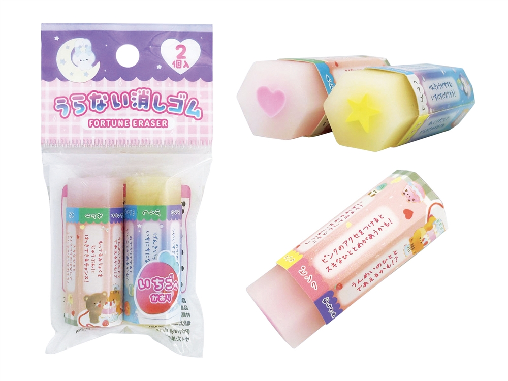 1個で今日の占い、ラッキーアイテムなど2種を楽しむ事ができます。2個とも違うデザインでそれぞれ別の占いが楽しめて、消しゴムにはいちごの香りが付いているのが特徴です。