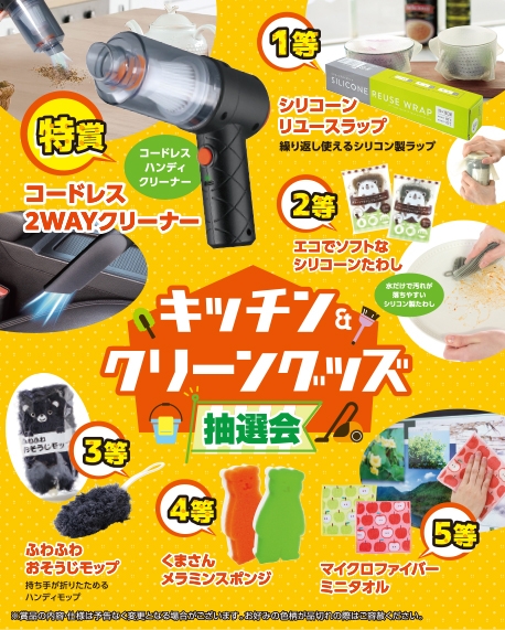 <キット内容> [特賞]コードレス2WAYクリーナー・・・1本 [1等]シリコーンリユースラップ・・・2本 [2等]エコでソフトなシリコーンたわし・・・3本 [3等]ふわふわおそうじモップ・・・4本 [4等]くまさんメラミンスポンジ・・・5本 [5等]マイクロファイバーミニタオル・・・35本 <付属品> 抽選くじ×50、抽選箱×1、くじ明細書×1、告知用A3ポスター×1 ※賞品の内容・仕様は画像と異なる場合があります。あらかじめご了承ください。