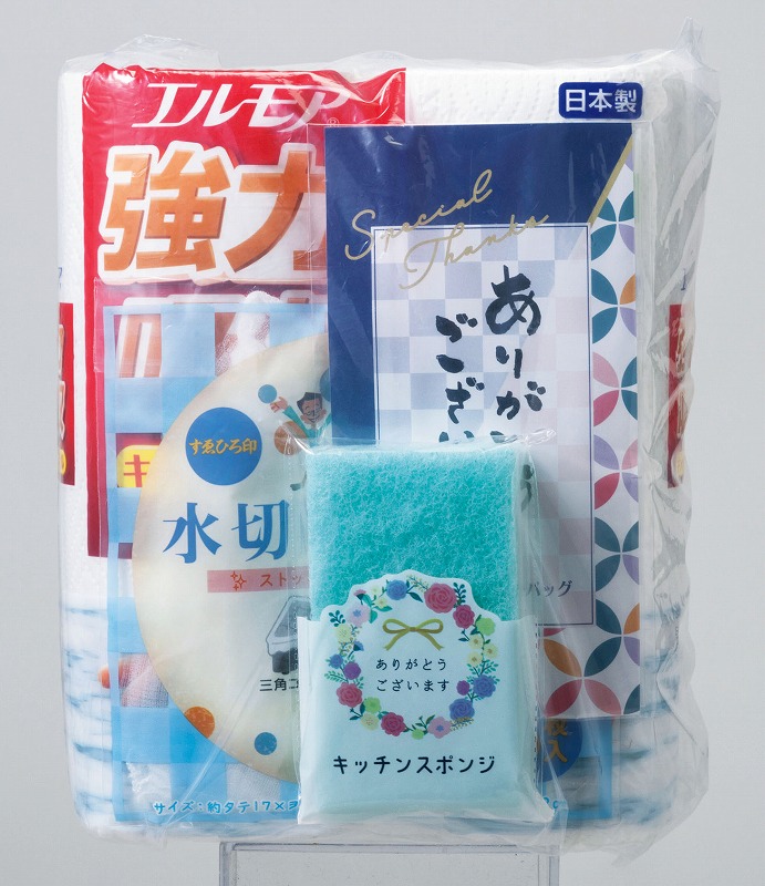 キッチンタオル2ロール、マチ付フリーザーバッグ2枚入、水切りネット5枚入、キッチンスポンジ1個、福袋:32×28×11.5cm