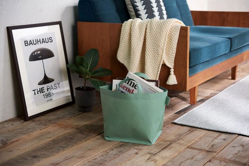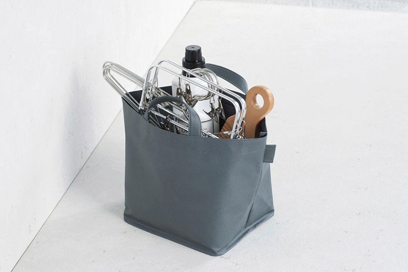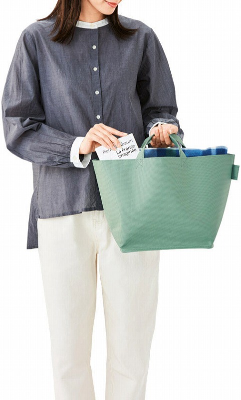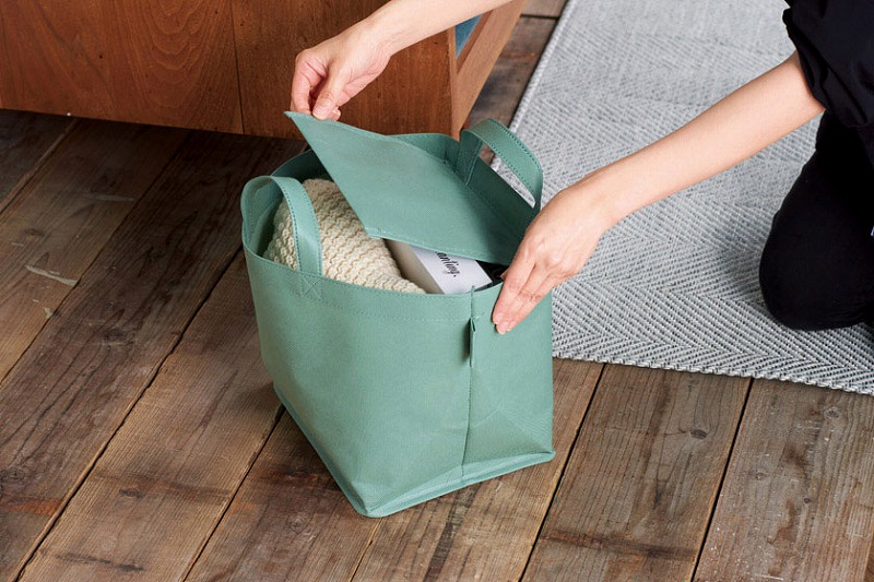中身を隠せるフラップ付の収納バッグ。 ポケット付でトートバッグとしても使用可能です。 暮らしに溶け込むナチュラルカラーがポイント。
