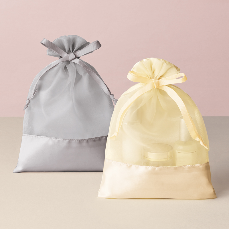 サテン×オーガンジーのエレガントな異素材MIX。中身をさり気なくアピールできる透け感がお洒落。気軽に持ち替えやすいポーチは、シーズン毎に替える人も少なくありません。そのため、ノベルティでは特に人気が高く、美容関連やインテリア、健康食品などあらゆるジャンルのノベルティにおすすめです。企業や会社の販促品・ノベルティでお困りの場合、おしゃれで安いオリジナルのものをご提案します。
