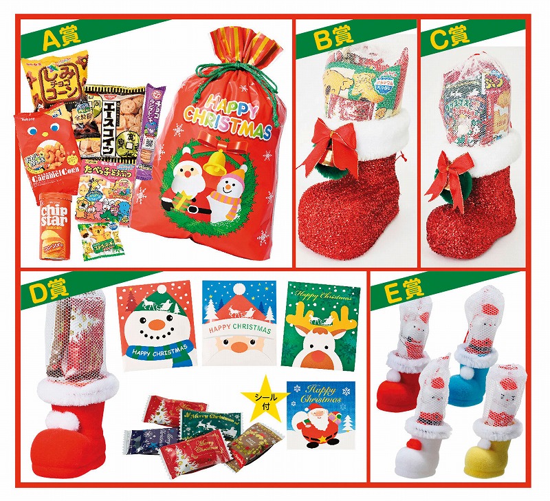 〇セット明細 ・A賞:クリスマス巾着(お菓子入)…2コ ・B賞:クリスマスラメブーツ(大)(お菓子入)…3コ ・C賞:クリスマスラメブーツ(中)(お菓子入)…5コ ・D賞:クリスマスミニブーツ(キャンディ2粒入)又は Xmasプチギフト(キャンディ5粒入・シール付)…22コ ・E賞:クリスマスカラフルブーツ(サンタチョコ入)…48コ 〇付属品 ・抽選セット(抽選箱・三角クジ)…1セット ・店頭ポスター(A2)…2枚 ・お知らせPOP(51×25cm)…2枚