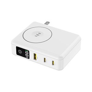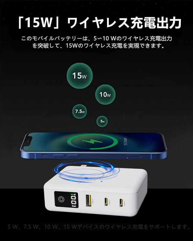 バッテリー容量:10000mAh 入力:AC 100-240?50 60Hz 1.5A Max 出力:GaNチャージャーモード(AC機能): USB -C1/C2 出力: 5?A/9?A/12?A/15?A/20?.25A (65W max) PPS: 3.3~21?A USB -A 出力: 5?.5A/4.5?A/5?A/9?A/12?A/20?.25A(65W max) バッテリー機能 USB -C1/C2 出力: 5?A/9?A/12?A/15?A/20?.25A (45W max) PPS: 3.3~16?.8A USB -A 出力: 5?.5A/4.5?A/5?A/9?A/12?A/20?.25A(45W max) Wireless(マグネット内蔵): 5W/7.5W/10W/15W max 充電時間: 4時間