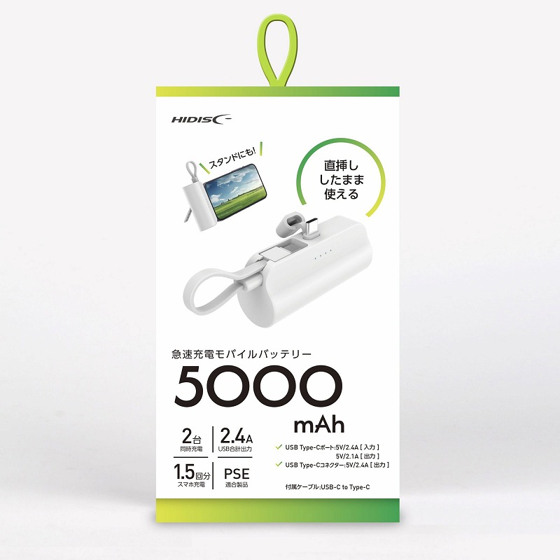 バッテリー容量:5000mAh 入力:Type-cポート input: 5?.4A(Max) 出力:Type-cポート input: 5?.1A(Max) Type-cコネクタ:5?2.1A (USB合計出力 2.4A)