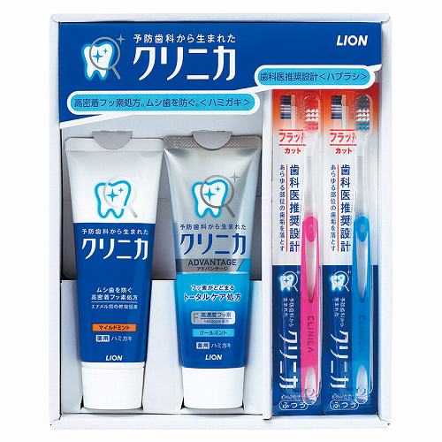 クリニカハミガキクールミントタテ型(約130g)・クリニカハミガキマイルドミントタテ型(約130g)×各1、クリニカハブラシフラットカット3列ふつう×2