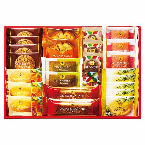 オレンジマドレーヌ・ストロベリーショコラケーキ・ブラウニー×各3、ピスタチオフィナンシェ・ブラウンシュガーパウンドケーキ・アーモンドキャラメルケーキ×各2、チョコチップクッキー×4、レモンクッキー×5