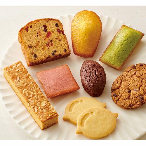 オレンジマドレーヌ・ピスタチオフィナンシェ×各3、ストロベリーショコラケーキ・ブラウニー×各4、ブラウンシュガーパウンドケーキ・アーモンドキャラメルケーキ×各2、チョコチップクッキー・レモンクッキー×各5