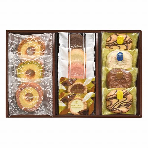 2層バームクーヘン(キャラメル&ミルク・抹茶&ミルク・ストロベリー&ミルク)・ガレット(プレーン・ココア・ストロベリー)・プチタルト(ミルクチョコ・ホワイトチョコ)・ミルクチョコクッキー・ホワイトチョコクッキー×各1、キャラメルチョコクッキー×2