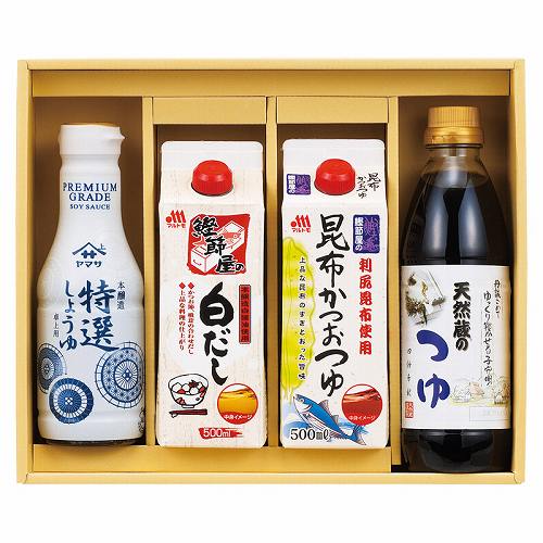 ヤマサ卓上特選しょうゆ(360ml)・伊賀越天然蔵のつゆ(500ml)・マルトモ昆布かつおつゆ(500ml)・マルトモ鰹節屋の白だし(500ml)×各1