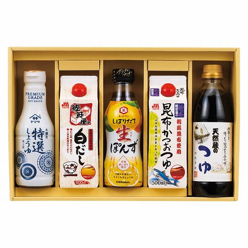 ヤマサ卓上特選しょうゆ(360ml)・伊賀越天然蔵のつゆ(500ml)・キッコーマンしぼりたて生ぽんず(360ml)・マルトモ昆布かつおつゆ(500ml)・マルトモ鰹節屋の白だし(500ml)×各1