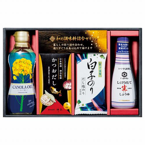 キッコーマンしぼりたて生醤油(200ml)・かつおだし(4g×8袋)・白子だし塩のり(8切5枚)・昭和キャノーラ油(300g)×各1