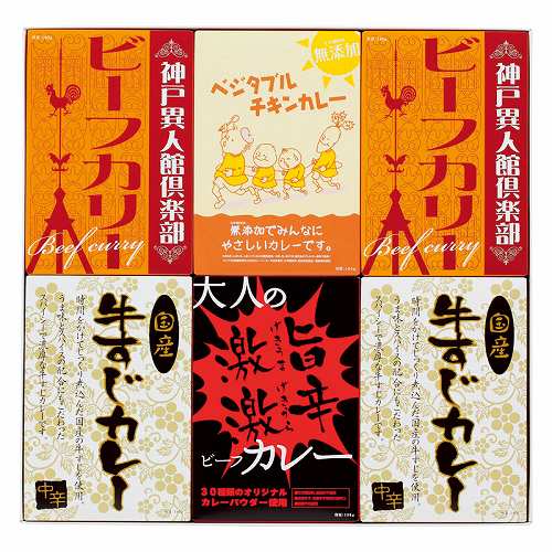 牛すじカレー(180g)・神戸異人館倶楽部ビーフカリー(180g)×各2、大人の激旨激辛カレー(180g)・ベジタブルチキンカレー(100g)×各1