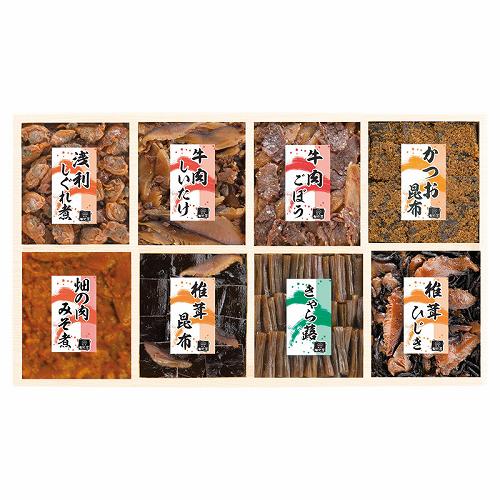 浅利しぐれ煮(50g)・牛肉しいたけ(50g)・牛肉ごぼう(50g)・かつお昆布(60g)・畑の肉みそ煮(50g)・椎茸昆布(60g)・きゃら蕗(60g)・椎茸ひじき(50g)×各1