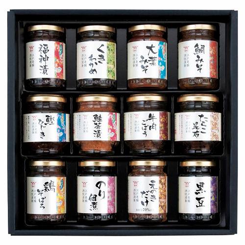 福神漬(90g)・くきわかめ(75g)・のり佃煮(95g)・鮭茶漬(60g)・鯛みそ(100g)・黒豆(100g)・えのきだけ(90g)・牛肉ごぼう(55g)・鰹ひじき(40g)・大葉みそ(100g)・鶏そぼろ(50g)・たらこ昆布(50g)×各1