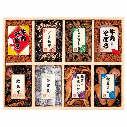 ごま昆布(45g)・汐富貴(20g)・しその実わかめ(45g)・鰹昆布(20g)・松茸昆布(50g)・椎茸入甘煮わかめ(45g)・国産牛肉そぼろ(45g)・国産牛肉そぼろ(山椒)(45g)×各1