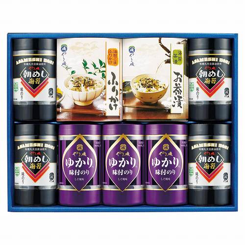 味付のり(8切26枚)×4、しそ風味のり(8切26枚)×3、のり茶漬け(5.5g×4袋)・のりふりかけ(5g×4袋)×各1