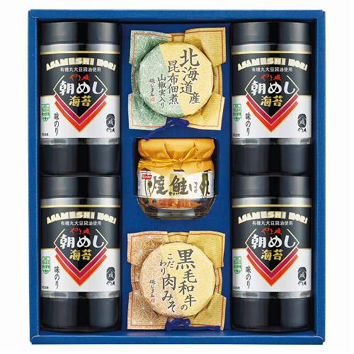 味付のり(8切26枚)×4、焼鮭ほぐし(50g)・北海道産昆布佃煮(70g)・黒毛和牛こだわり肉みそ(90g)×各1
