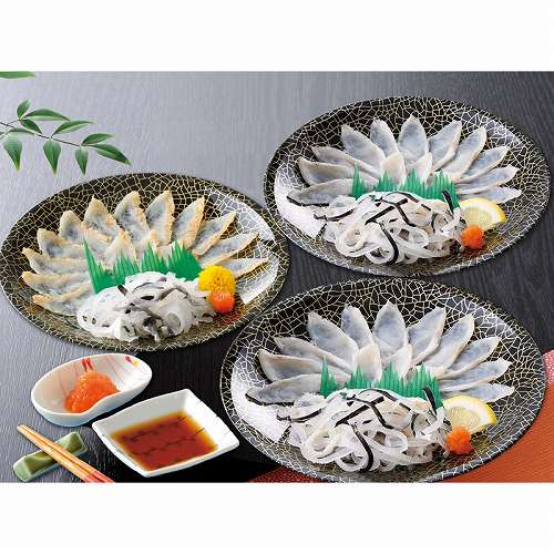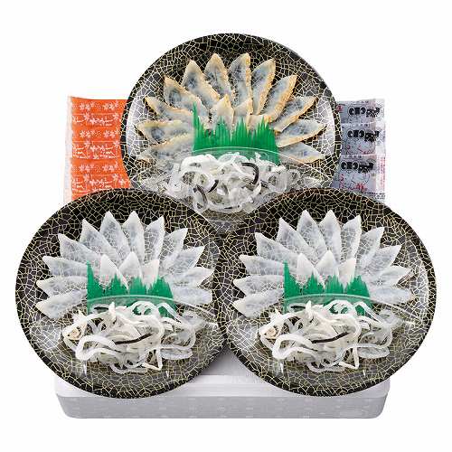 真ふぐ霜降り刺身(20g)×2、真ふぐたたき刺身(20g)×1、とらふぐ皮(20g)・ふくポン酢(10g)・もみじおろし(10g)×各3
