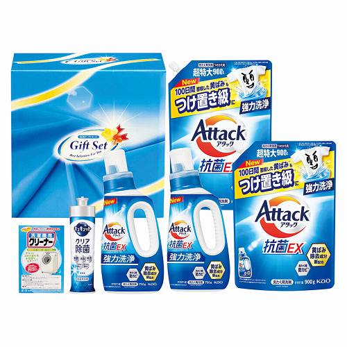花王アタック抗菌EX(750g)・花王アタック抗菌EX詰め替え特大(900g)×各2、花王キュキュットクリア除菌(220ml)・洗濯機用クリーナーM×各1