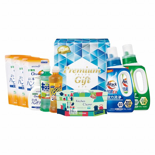 花王アタック抗菌EX(750g)・花王アタック抗菌EX部屋干し用(720g)・弱酸性ジェルハンドソープ(200ml)・オレンジマイルドコンパクト(270ml)・キッチンクリーナー(24枚)・キッチンリフレッシュコンパクト(270ml)×各1、弱酸性ジェルハンドソープ詰め替え(190ml)×3
