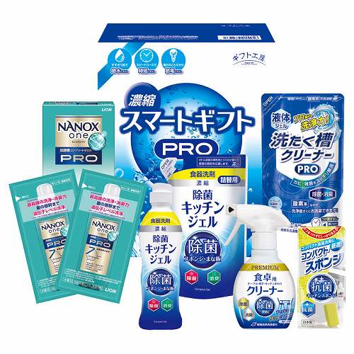 ライオンナノックスワンPRO(10g×2)・除菌キッチンジェル(200ml)・除菌キッチンジェル詰め替え(160ml)・食卓用クリーナー(260ml)・コンパクトスポンジ・液体洗たく槽クリーナーPRO(200g)×各1