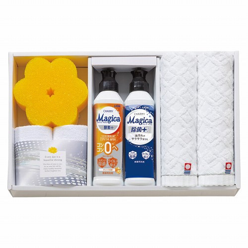 チャーミーマジカオレンジの香り(220ml)・チャーミーマジカ除菌プラス(220ml)・スポンジ×各1、マイクロファイバークロス(250×250)・ウォッシュタオル(280×300)×各2