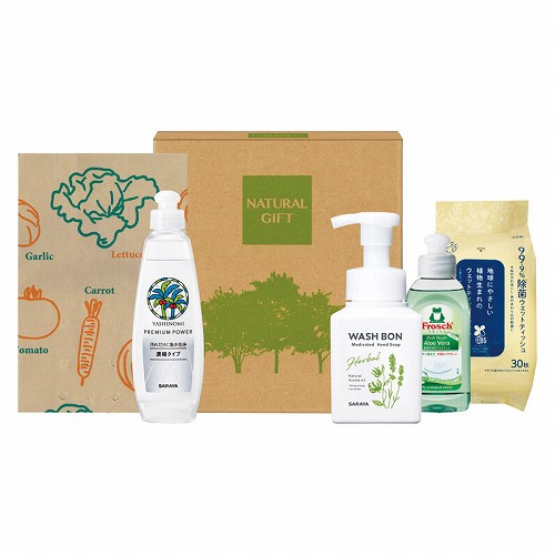 フロッシュ食器用洗剤アロエヴィラ(100ml)・ちきゅうおもい99.9%除菌ウェットティッシュ(30枚)・サラヤヤシノミ洗剤プレミアムパワー(200ml)・紙製水切り袋・サラヤウォッシュボン(310ml)×各1